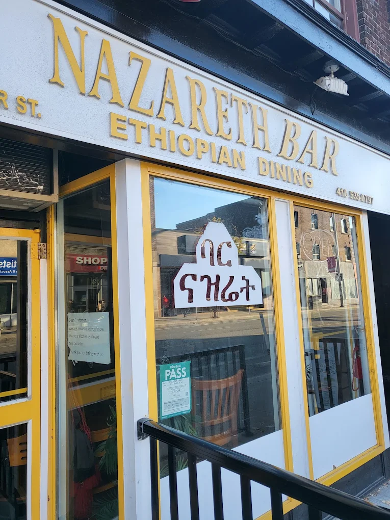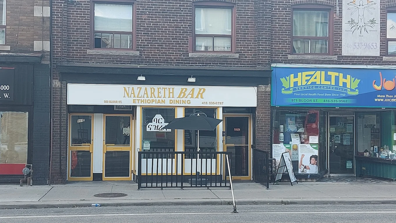 Nazareth Bar at 969 Bloor St W in Toronto, Ontario is a vibrant Ethiopian restaurant and bar offering generous, affordable platters of authentic Habesha cuisine. With outdoor seating and live music, Nazareth is a lively gathering spot for the Ethiopian and Eritrean community on Bloor West. Call +1 416-535-0797 for hours and reservations.